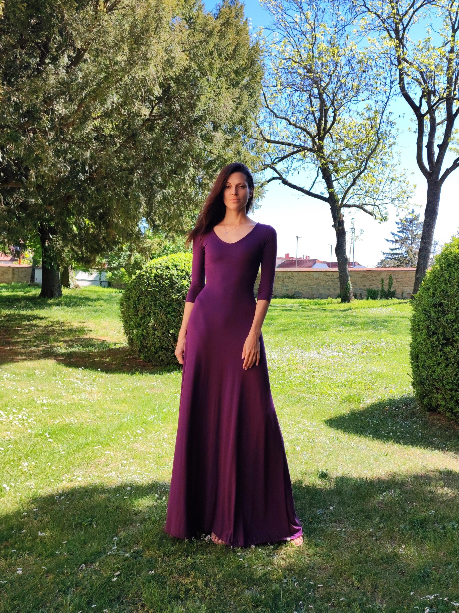Elegant long maxi dress with a flattering V-neckline, three-quarter sleeves, and a fitted bodice that flows into a soft, floor-length skirt. Made from lightweight fabric for effortless movement and timeless sophistication. Perfect for both casual elegance and special occasions.