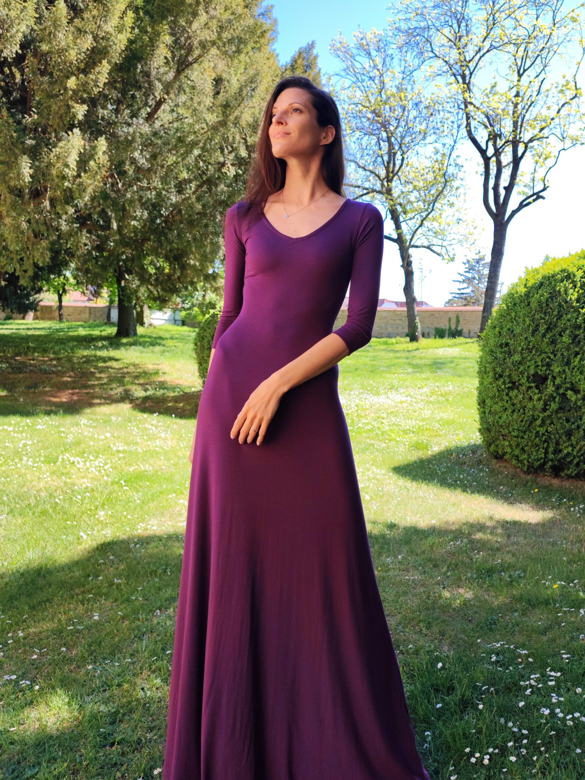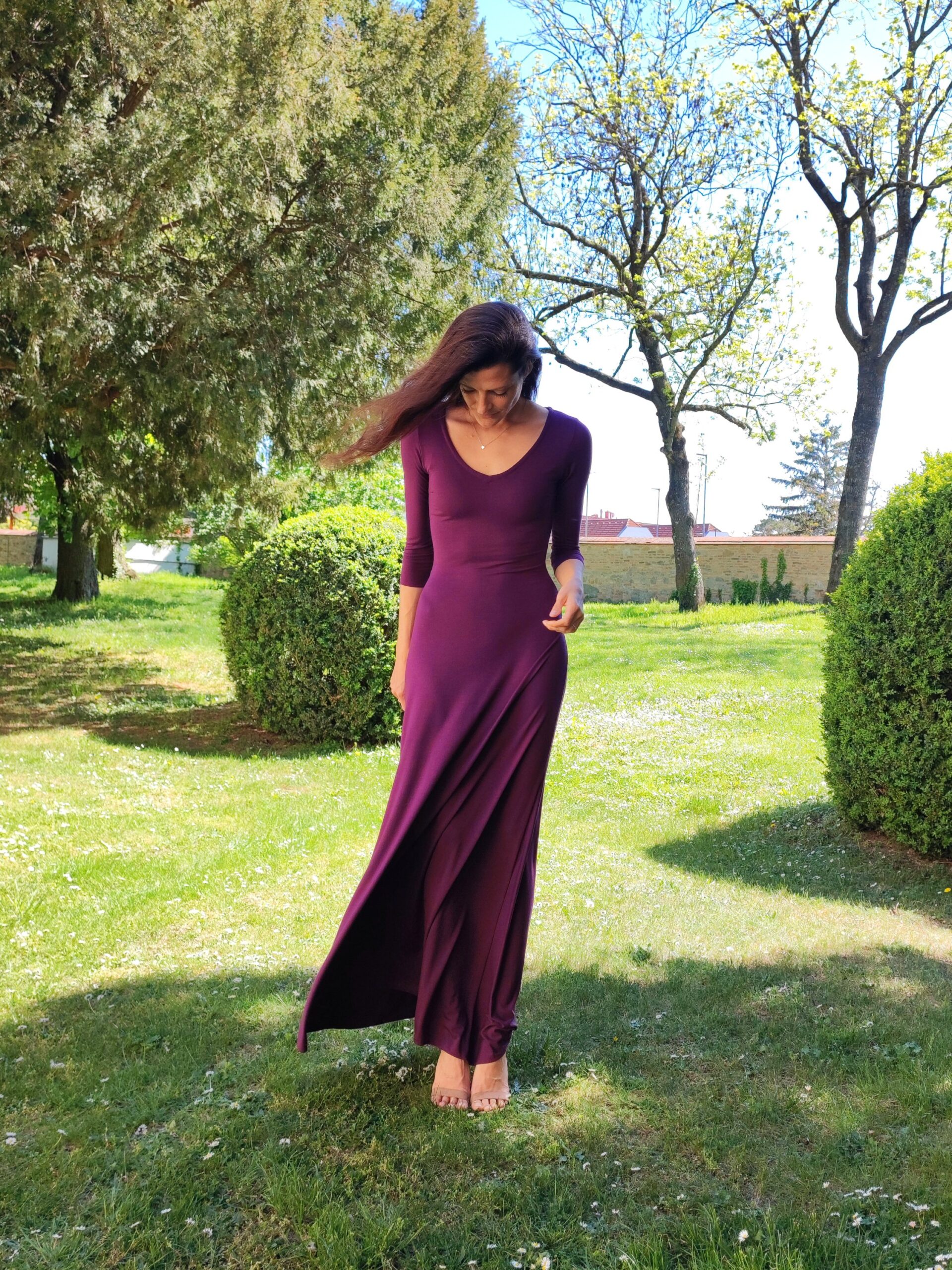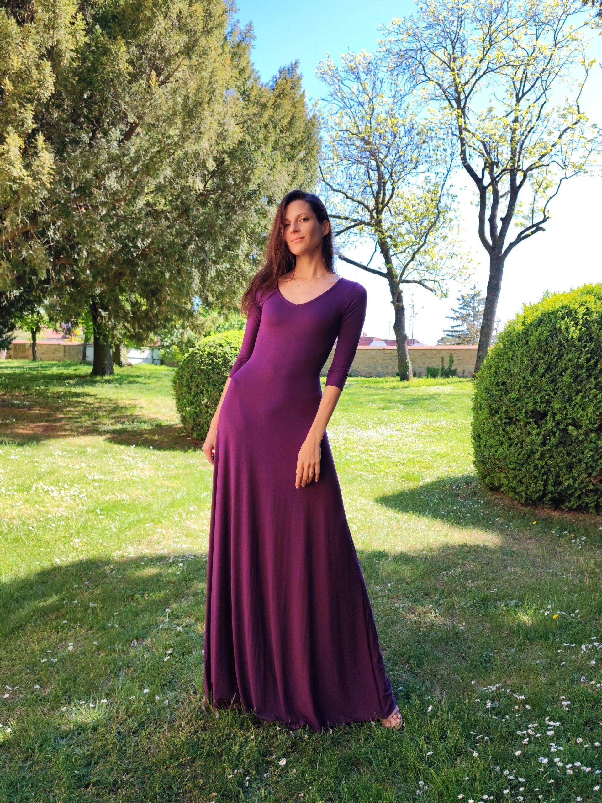 Step into timeless elegance with this Modal Purple Maxi Dress — a perfect blend of sophistication and comfort. This dress features a graceful floor-length silhouette that flows beautifully with every step. The fitted bodice accentuates the waist, while the gentle flare of the skirt adds a romantic touch.